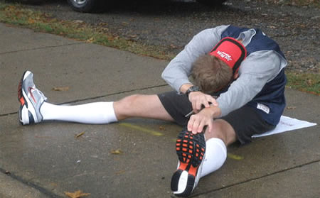 Debemos estirar bien todos los músculos de las piernas. Comenzamos con las pantorrillas cruzando las piernas y parados sobre un sólo pie, nos inclinamos hacia adelante apoyándonos en una pared.