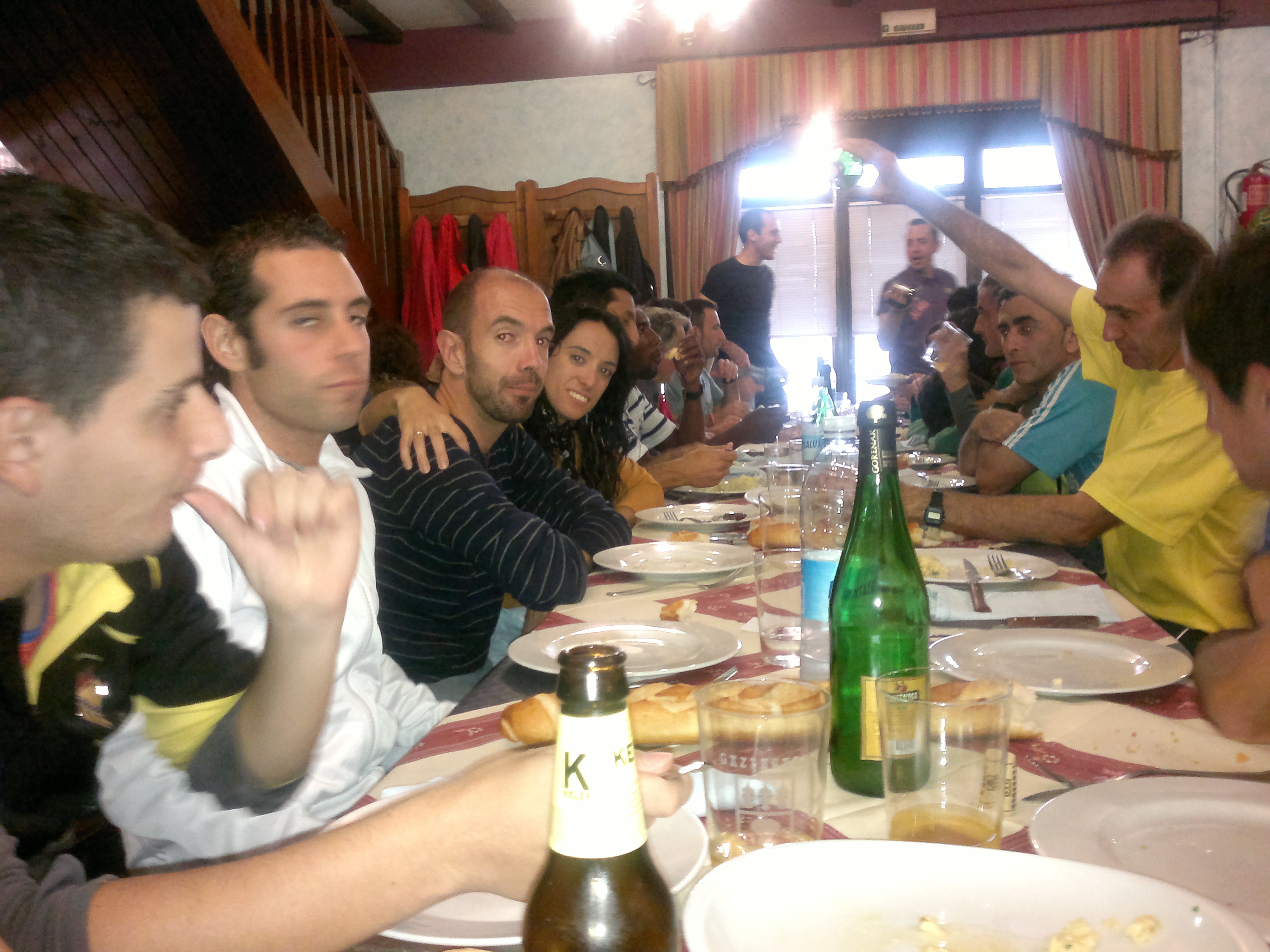 Este fin de semana, l@s runnerabejas estábamos en dos frentes, y los dos peliagudos. Por un lado, 12 runners íbamos a disfrutar de la carrera popular mas importante de España, la madre de todas la carreras, la mítica BEHOBIA-SAN SEBASTIAN. Por otro lado, teníamos que sacar adelante nuestro primer «stand» en un día tan importante para Azagra como es el domingo en este fin de semana dedicado a San gregorio. Sabíamos de la dificultad de ambos retos, pero no nos amedrentamos y fuimos a por ellos como sabemos, con humildad, sin arrogancia, pero fuertes y seguros sabedores de que el trabajo bien hecho, al final da sus frutos. A las siete de la mañana ya venía el Bus dirección a Behobia a recogernos. 10 corredor@s del club, mas dos compañeros de San Adrian formamos la expedición. Allí en Behobia, se nos unirían los hermanos Sola, que han pasado la noche en San sebastian. En total, 12 corredores de nuestro club. Solo un dato, el viernes, ponías la palabra Azagra, en la web de la carrera, y en 47 ediciones, solo aparecían dos corredores, Carlos Vidondo y el que suscribe. En apenas solo un año, hemos conseguido que 12 personas de Azagra, disputen una carrera, que es casi una media maratón, pero de las mas dura. Seguro que habrá gente que no sepa valorar o simplemente desdeñen este dato, pero es sin duda, un gran éxito. El viaje se hizo corto, y a las 9’30 horas y acompañados de nuestros amigos de Villafranca y Cadreita, ya llegamos a la salida. Los novatos, impresionados. Ver una linea de salida, con alrededor de 25.000 personas, es para quedarse de piedra. Como la temperatura acompañaba, mas de 20º, la espera se hace llevadera y el buen ambiente entre nosotros, hace que estemos casi todo el tiempo riendo. Mientras, a las 08’30 horas de la mañana, nuestra Secre, Beatriz, junto con Isa, Monica y Victor ( que causó baja a ultima hora de la carrera por molestias en una rodilla) ya estaban recogiendo material para nuestro pequeño puesto. La idea, vender un poco de imagen, participar en las actividades que se producen en nuestro pueblo y de paso, por que no, sacar algunas perrilas, que a las arcas de un club tan pequeño, siempre le viene bien.Camisetas, pulseras, pendientes, etc…vino con tostadas, y rifa de un jamon, amén de información sobre nuestras actividades, eran nuestra oferta. Y como era la primera vez, las dudas eran muchas…En cambio, en la carrera, nosotros no teníamos ninguna. Nuestro objetivo, disfrutar de la carrera, del ambiente, empaparnos de Behobia. Nos sacamos alguna foto,y vemos de todo, runners muy bien preparados, otros, todo lo contrario, equipos con muchos corredores, otros con menos,equipos femeninos, equipos extranjeros, equipos vecinos, gente por libre. Los baños son escasos y están muy solicitados, por lo que para el tema de las necesidades hay que buscarse la vida, lo que provoca alguna escena curiosa .La hora de la salida ya se va acercando. La buena musica nos hace bailar y una pantalla gigante nos da la verdadera dimensión de la carrera ya que durante mas de una hora no cesan de salir corredores. Es increíble. En Azagra, ya empieza la venta de tostadas, y lo hace a un ritmo endiablado. Nuestros runners no dan a basto. A media mañana, se le une Nacho Losantos, que a pesar de ir guapo de domingo, no se le caen los anillos y pone a calentar tostadas como el que mas. Nuestra puesto va viento en popa. Y nosotros, casi sin darnos cuenta, estamos ya corriendo. Del punto de unión, hasta realizar la salida, casi tenemos que correr-andar un km. Salimos todos juntos, Carlos, Guillermo, Tania, Fran, Jesus, Pablo,Jesus Mari, Jose ramon, Fernando , Carlos Oses y Pablo Ariza. El plan era ir casi todos juntos, pero bueno, ya sabemos como son las carreras y a veces el cuerpo o simplemente la carrera, sin darte cuenta pide mas o al revés. El ambiente hace que Fran, Guillermo , Pablo y Carlos Oses salgan mas rápido de la cuenta. A Carlos Vidondo, le sorprende, con razón , por que no era lo acordado y se queda un poco atrás, con la compañía de Jose Ramon. Los demás, siguen a su paso, sin prisa pero sin pausa. El calor es importante, por lo que el agua se convierte en divino tesoro. Los puntos de avituallamiento se convierten en pequeñas trincheras para conseguir un vaso medio de agua con mal sabor. La carretera, llena de corredores, es sinuosa y como salimos en el grupo de atrás, el adelantamiento de gente es continuo y peligroso. Primera subida , el calor y el ritmo excesivo, hacen que Carlos Oses se baje del grupo. Guillermo siente molestias en un gemelo y se queda un poco atrasado. Carlos Vidondo y Jose ramon van bastante bien. Nuestra única fémina, Tania, también va genial. Que bueno, que esta gran corredora, pero sobre todo, buena persona, esté con nosotros. Jesus Mari, se ha quedado solo. Se le va a hacer dura esta carrera, pero está preparado para sufrir. Los hermanos Sola, lo llevan bien y Fernando , también. No nos cansamos de decirlo, Fernando es increíble, un sufridor nato, pero sin duda, de los mas valientes del club. Bravo Fernando.Bravo Isabel, que has hecho de las tostadas un arte. Tanto éxito han tenido, que la gente miraba las tinajas como si tuvieran el bálsamo de Fierabras, solicitando la receta, cuando la única receta que hay, es pasarse tres días mezclando el aceite con el ajo…..Gracias Isabel. El pan se acaba, Javi Muñoz se une al grupo, y las colas de gente que quiere su tostada cada vez son mas grandes. Vaya con los del club de atletismo, dice la gente, que bien se lo han montado…..Como Fran Peñas, que cada vez va mas rápido. Pablo le sigue, y observa como el calor, está causando estragos en la carrera. Gente vomitando a los lados, ambulancias yendo y viniendo a toda pastilla, corredores tirados en los costados, gente andando por que no pueden mas….la carrera se está tornando épica. Por detrás, ya se empieza a notar el sufrimiento en su máxima expresión. Jose Ramon ya nota los primeros s