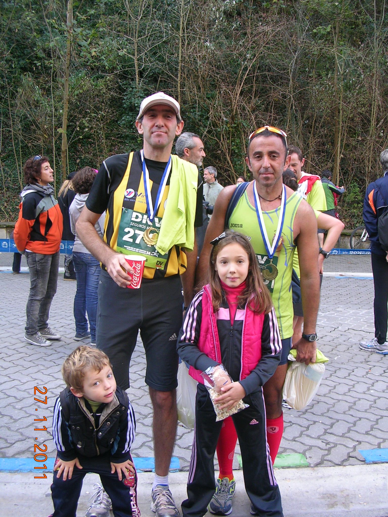 Nunca me han atraído los maratones. Esto, dicho por una apasionado del running, puede sonar como un sinsentido. Pero es la verdad. No puedo dar una unica explicación a mi no-amor por este tipo de prueba, y darlas todas, sería muy extenso. Sin embargo, no me sentía un corredor completo…muchas medias, alguna carrera dura de montaña, trails, infinitos 10kms, muchos 15..5…millas…pero nunca unos 42 casi 200 como Dios manda. Por esto, esta temporada, había marcado en rojo esta fecha, el 27 de noviembre, como el día indicado para estrenarme en la prueba reina del running: EL MARATON y mi localidad elegida era San sebastian. Para esta aventura, no podía tener mejor compañero que Carlos Vidondo, nuestro corredor mas veterano, no por edad, sino por el tiempo que lleva corriendo, por sus experiencias acumuladas y sobre todo por como sabe gestionar este tipo de carreras. No lleva GPS, ni pulsometro ni leches que valgan, un casio de toda la vida, pero sabe en todo momento el ritmo que llevas, la distancia , el pulso….pero no de una manera cercana, no, son medidas exactas…es una pasada , y cuando vienen malas, siempre tiene un hombro para ayudarte. Todo una garantía de éxito. Por esto, cuando viajaba el sábado por la tarde hacia esta bonita ciudad, y los temores se asomaban, solo me tenía que acordar de la compañía y estos se atenuaban. De todas formas, estos, los miedos, siempre están ahí…..vienen en forma de cansancio, de mal entreno, de desgana, de no saber como responderá mi cuerpo y también de un cierto hartazgo de competición. LLego al estadio de Anoeta y recojo el dorsal. El ambiente es runner total, y sin querer, veo un vomitorio abierto, por lo que aprovecho para entrar en el césped y ver donde será la llegada…..ALUCINANTE….el vello se me pone de punta, y solo desearía que todos los componentes del club pudiesen tener esa imagen que tenía delante. Después de estar un tiempo, me pareció un minuto, pero fue mas de media hora, me voy , no sin tener la certeza, de que al día siguiente, de una manera u de otra, yo iba a llegar a esa meta. Con todo, me espera lo mas duro. La soledad de una habitación de un hotel cualquiera. Muchas veces pienso que Sillitoe, cuando escribió la soledad del corredor de fondo, pasó alguna vez por esta experiencia. Supero la prueba, televisión, fútbol, y encima con buenas noticias…bueno es el momento de echarle «geta» y hablar de running. A las siete suena el despertador, y los nervios se aceleran. Poner dorsal, chip, por que diablos no lo hice ayer….donde están mis calcetines preferidos…en Azagra…esta camiseta me gusta…esta no…ains…al baño corriendo. Salgo pitando, y tardo en encontrar los aparcamientos. Un café rápido en una «tasca» cercana, con borracho incluido, que me desea suerte cayéndose de la silla. La mañana fresquita, pero con sol, como a mi me gustan. A la consigna, ya es hora de cambiarse y dejar la maleta. Mientras me cambio, me agobio un poco,y viene el pensamiento recurrente…»que demonios hago yo aquí»….rápido lo desecho y preparo todo lo necesario. Remoloneo un poco, fuera hace frio, y entrego la maleta. 30 minutos para la salida, a buscar a Carlos, que había pernoctado en Andoain. Hoy sale con la camiseta nueva, bueno, con el molde de la camiseta nueva, para probar el tejido. Busco una abeja, pero me encuentro a Ricardo Abad, el de los 500 maratones seguidos, le saludo, también veo a Rafa Jofresa, el base del Juventud de Badalona, a amigos de otros clubs..pero falta Carlos….15 minutos y no lo veo…10 y allí está. Que bien le queda la camiseta. Viene apurado, se ha perdido y casi no llega. Ya me extrañaba, con lo metódico que es para todo. Casi ni hablamos y ya estamos en la salida. El respeto a la prueba, hace que salgamos con la liebre de 3’45. Luego, si nos vemos bien, aceleramos un poco. Sin darnos cuenta, ya estamos saliendo..nervios..empezamos una aventura sin retorno. El ritmo, lento, hace que el cuerpo se vaya calentando poco a poco. Las sensaciones son raras. Por el km 5 siento muchas molestias en la rodilla derecha, pero el ritmo me permite hacer unas cuantas flexiones y se me alivia..menos mal. Me acuerdo del dichoso padel. El ambiente es fenomenal, increíble. La gente animando, grupos musicales….bueno, ya nos vamos acercando al km 10. La única pega, mucha gente en el grupo en el que estabamos. Para evitar esto, adelantamos a la liebre y vamos un poco por libre…que agusto. 15 km y a Carlos le empieza a doler un gemelo, creo que el izquierdo, pero no estoy seguro. Se para, estira, anda corriendo hacia atrás….un corredor me dice que tiene merito hacer una maraton así, le digo que es un promesa…jaja….no sele pasa, y me entran las preocupaciones, pero a el mas. LLega el fatídico momento, me dice que no puede mas, que se para. El mundo se me viene abajo, pero tengo que seguir, no puedo hundirme con el. Sigo yo solo, sin esperanzas de volver a verlo correr. Mi reloj me transmite buenas señales, 5’00 el km y 130 de pulsaciones. Siempre llevo una botella de agua, creo que con el día que hace, la hidratación va a ser importante. Media maratón, todo perfecto para mí, las sensaciones buenísimas…de repente alguien se acerca y me ofrece agua…¡Carlos!…pero que ha pasado?..que alegría…pero apenas le puedo preguntar, por que el tío va como un rayo y me adelanta, sacándome en un trecho casi medio minuto. No me vuelvo loco. Se lo importante que es mantener un ritmo en maratón y no me quiero acelerar. Poco a poco, me voy acercando a el otra vez y nos volvemos a hacer compañía. Hablamos poco, ya sabemos los dos de que va esto. Carlos anda un poco a tirones, cosa que me sorprende, por que es un corredor muy de ritmos constantes. Aceleramos casi sin querer, y llegamos a realizar un par de kilometros casi a 4’30. A pesar de encontrarme bien, esto no me gusta y decido tranquilizarme. Km 30 y de repente, se me aparece el temido muro. De i