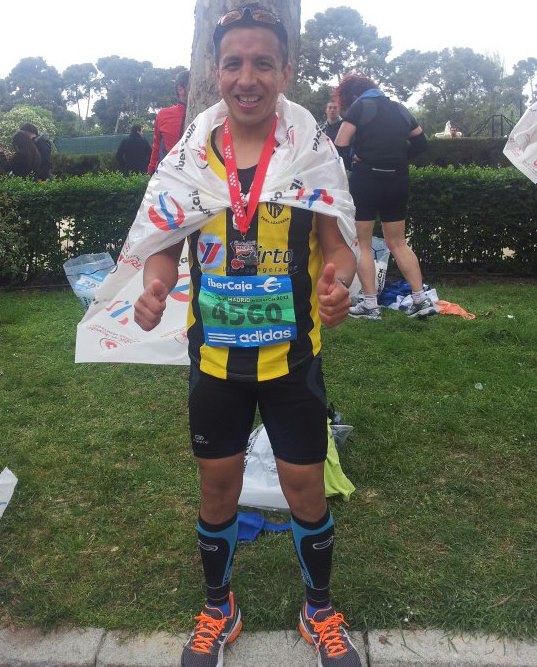 Este domingo se disputó la dura maraton de Madrid. Si ya de por si está prueba es la mas importante cita de atletas populares en España, este año cobraba mas interes y mas sentimiento por lo acontecido en Bostan. Nosotros, los runnerabejas, este año la hemos vivido todavía con mas emoción, pues uno de los nuestros estaba allí, «BIODIESEL» Alberto, nuestro amigo infatigable. Este año está siendo muy especial para el, con sentimientos muy encontrados. El está aquí, con su familia, pero está edificando su futuro en su país de origen, su querido Ecuador . Mientras espera a que la lenta burocracia haga su trabajo, entrena con nosotros, y sin duda, su corazón, perseverancia y compañerismo, nos ha ganado a todos. Ya no es un socio mas, es un socio especial y cuando falta en un entreno, se nota mucho su ausencia. El sabe lo que significa para nosotros, y ahora, aunque sabe que tiene que marcharse, la espera la agredece, y estoy seguro que por su cabeza ronda una mezcla de alegría por estar con nosotros con una pizca de amargura por que sabe que tarde o temprano retornará su otro país. En alguna parte leí, que uno no elige el momento en el que corre un maratón, que es la carrera cuando te dice que ya estás preparado para afrontar la madre de todos los retos. Y este era el momento de Alberto. Ama tanto el running, que ha involucrado de forma directa a su otro gran amor, su familiar. Da gusto verle siempre acompañado de los suyos, disfrutando con el, sufriendo también con el. Seguro que en esta durisima maraton de Madrid, muchas cosas le han venido a la cabeza. En el km 8 ya sufría mucho por una pequeña lesión, como las cornadas que te pega la vida, que te hacen flaquear, pero continuas adelante. Por el km 20 le empezarían las dudas, queda mas de la mitad, los dolores no remiten…..pero piensa en su equipo, en su familia, en sus proyectos de futuro..y sabe que merece la pena continuar. Por el km30 se arma de valor, viene lo mas duro, lo mas complicado…..toda su vida va pasando por su cabeza, son como pequeños fotogramas que pasan a toda velocidad, y sabe que nadie le ha regalado nada, que tiene que echar el resto. LLega al temido «muro», y piensa que se ha quedado corto de kms en su preparación, pero se consuela pensando en los duros entrenamientos por los montes de Azagra. LLeva ya cuatro horas corriendo, y no siente las piernas, apenas responden a sus estimulos, es como si fueran solas!!! Dos kms le quedan..es tan poco y es tanto!!! no se acaban….oye el run-run de la meta, y casi se le escapan las lagrimas. Cruza la linea de llegada, y se acuerda de su familia, de su club, de todos..mas de 4 horas corriendo, y cuando llega, se da cuenta de que se trataba…no era de terminar su maratón, sino de disfrutar haciendola, de sentir lo que solo se siente en esta carrera, de las emociones que te da, de todo lo que te aporta en esos mas de 42 km. Es un hombre feliz, y, pese a que está machacado, ya sabe que no va a ser su ultima maratón, y también sabe, que siempre, para siempre, va a ser uno de los nuestros, un runnerabeja.!!! ENHORABUENA, ALBERTO Y GRACIAS POR ESTAR CON NOSOTROS!!!!. Si me lo permitís, quiero dedicar esta pequeña y humilde cronica a nuestros compañeros que sufrieron el terrible atentado de Boston, VA POR ELLOS!!!