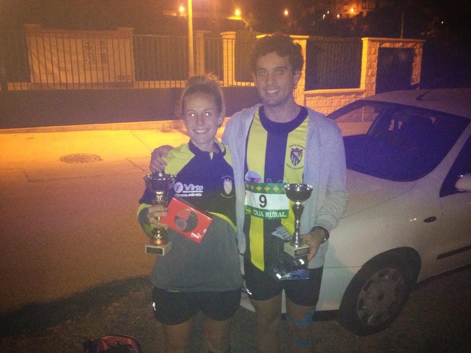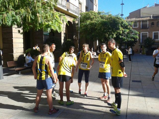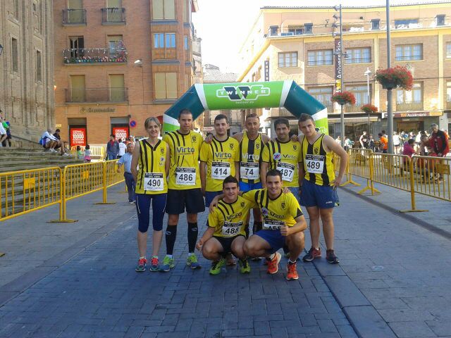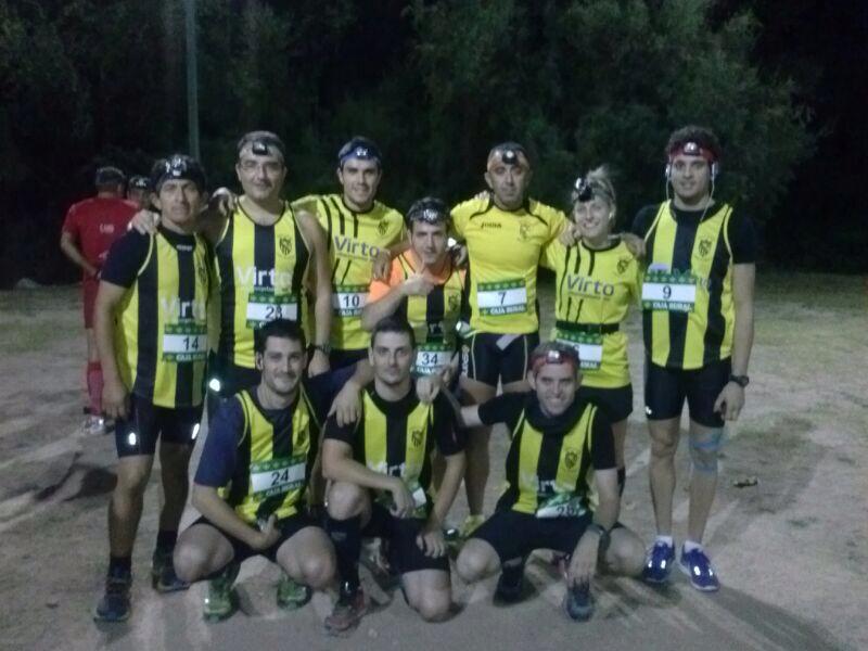 La noche del viernes al sábado, mientras escuchabahttp://www.youtube.com/watch?v=tXtATeQ7GKg pensaba, con un poco de temor, que pasaría el día que el club tocara techo, si es que no había hecho ya…..algunas veces tengo la sensación de que les pido mucho a est@s corredores, algunos ya con muchos kms sin apenas descanso en el verano y que todo podía reventar sin mas… pobre de mi, no tenía ni idea del finde que me esperaba!!! La gran cita era en Calahorra, donde nuestros amigos del 360º habían organizado su primera carrera, atreviendose ni mas ni menos que con una nocturna por la zona del pantano de Calahorra. Ramiro, uno de los componentes mas antiguos del equipo riojano, con gran experiencia en ultras de montaña, es el «padre» de esta carrera, y el fue el que corrió con el grueso de la organización. Además de compañero de carreras, es un buen amigo este asturiano que vino a pescar su forma de vida en esta zona de España, por lo que no podíamos fallarle. Pero mientras por la tarde algunos nos afanabamos en preparar nuestras lamparillas de minero, Tulio y su hijo Rodrigo se habían desplazado hasta Cortes para disputar una de las ultimas carreras de verano de la zona. La primera gran alegría llego con ellos, vía wasthapp, donde nos enteramos que Tulio consigue un excelente tercer lugar y que Rodrigo había ganado la prueba en su categoría….la alegría es muy grande, pero rápido me viene una duda a la cabeza….si Tulio ha corrido en Cortes, que Tulio es el que va a correr en Calahorra por la noche?…vaya duda mas tonta!!!. y vaya familia que tenemos con estos Mocha…un día si y el otro también no paran de darnos alegrías,,,son increíbles. La sonrisa se me dibuja en la cara, al mismo tiempo que me pregunto que sorpresas nos tendrá preparada Ramirin en su carrera….no me fio de esta gente de montaña…jejeje. A las 9 de la noche, ya nos vamos viendo las caras en el bar Leyre los participantes de la carrera nocturna…uno no sabe si tomarse un café o un vaso de leche con magdalenas….o simplemente cenar…yo por si acaso voy con el estomago muy liviano y me tomo un cafetito. Nada mas y nada menos que once corredores formamos parte de la expedición. Virginia, la única fémina que va a competir del club, está algo nerviosa a la par que ilusionada. También Koeman, al que le gustan mucho este tipo de pruebas. El resto lo formamos, Patxi, Jorge, Pedro, los hermanos Oses, los Mocha, Guillermo y yo, Pablo. El segundo grupo mas numeroso después, claro está, del 360. En la salida, desde el parque cidacos de Calahorra, se detecta un ambiente runner total. Nos esperan Carlos y Olmo, que junto con sus hijos, la familia de Guillermo, esposas de los Mocha y Fosi, hacen que nos sintamos como en casa….que gozada y que calorcito nos dan!!! No hay muchos corredores inscritos, pero es normal, es la primera prueba, encima de noche, y una sabado a las 22…..uffff!!! te tiene que gustar mucho el running y tener mucha libertad, para estar en la linea de salida!!. Después de saludar a muchos amigos, de preguntar un poco por el circuito y de estirar un poco, que siempre ayuda a mitigar los nervios, nos encontramos listos para tomar la salida. La foto, con todos los frontales encendidos es espectacular…Ramiro nos da la salida con voz entrecortada por la emoción y casi sin querer estamos corriendo….las primeras sensaciones son extrañas, pero en el km2 ya casi no te das cuenta ni de que es de noche ni que llevas frontal y se parece todo a una carrera normal. Decido tomar la iniciativa del grupo principal, acompañado por Pedro, Jorge y Roberto. Mas adelante a salido Tulio como siempre, como un rayo. Atrás, Koeman y Carlos Oses, seguidos por Fernando, Virginia, Guillermo y Patxi que van bien juntitos y disfrutando al mismo tiempo que comentan la carrera.Como los primeros kms sé que son muy llanos, sigo apretando y adelantando gente…el ritmo es bueno y me siguen todos…cogemos a Tulio,y los cinco avanzamos hacía una incógnita que rápido descubriremos. Ya por el km 6 la cosa se pone un poco mas seria y noto que Pedro y Jorge tienen buenas sensaciones. También Roberto anda bien, pero a Tulio se le nota que no tiene la chispa de otras veces, sin duda algo cansado por el esfuerzo en Cortes. La pista está bien señalizada con balizas de color verde para el recorrido normal y rojas para la parte mas peligrosa. LLegamos a zona roja y Pedro da el primer apretón, al que solo puede seguir Jorge. Mas adelante, dejo pasar a Roberto, al cual estaba entorpeciendo y la carrera ya se torna técnica. Para un corredor experto en montaña, sería una autopista, para nosotros, runners de asfalto con escapadas a monte bajo, con la alevosía de la nocturnidad, se nos hace muy técnica. Muy por delante, veo a Pedro que vuela, como si llevara las piernas en el aire, mientras Jorge, con una temporada mas enfocada al asfalto, se las ve y se las desea por seguir su ritmo. Miro para atrás y ver el reguero de luces en procesión hace que se me ponga la piel de gallina y por momentos casi me emociono…es un bello espectáculo!!. De repente, una bajada peligrosilla y una subida con ayuda de manos, y un rodeo a un agujero hacia el infierno, y vuelta para arriba, y vuelta para abajo, siempre mirando el camino, lleno de raices y piedras, como si Ramiro hubiese estado un año colocando todo eso por allí para hacer que nos acordaramos de sus santos padres, que un día decidieron crear a un loco asturiano enamorado de la montaña y de sus peces. Mis piernas no dan para mas y me acuerdo del grupo trasero , de Virginia, de Patxi, de Fernando, de lo mucho que tienen que estar sufriendo. Después de un casi esguince de tobillo y una mas que probable salida de rotula, me replanteo el ritmo y decido bajar la intensidad…entonces se me echan encima corredores a tropel, muchos del 360 que se conocen como la palma de su mano el camino..no me pongo nervioso, prefiero ir tranquilo, llevo las piernas m