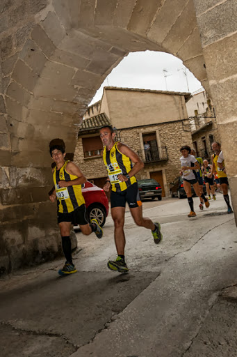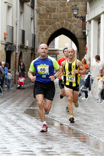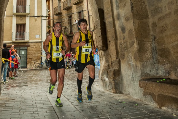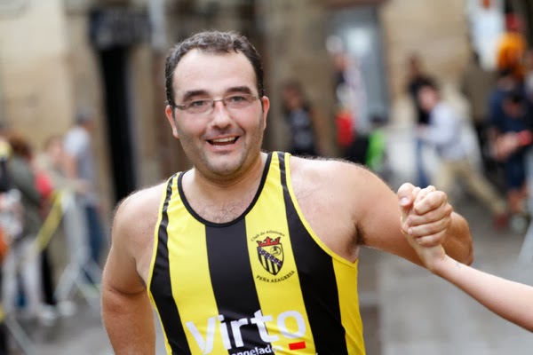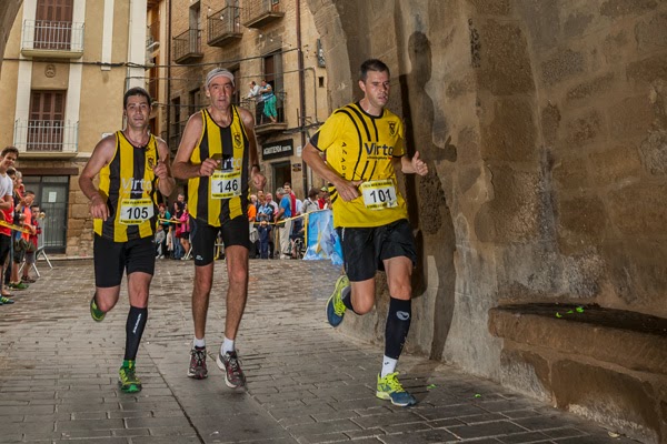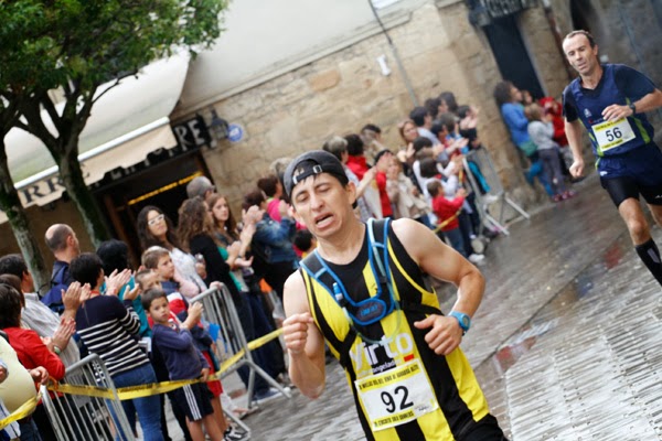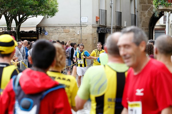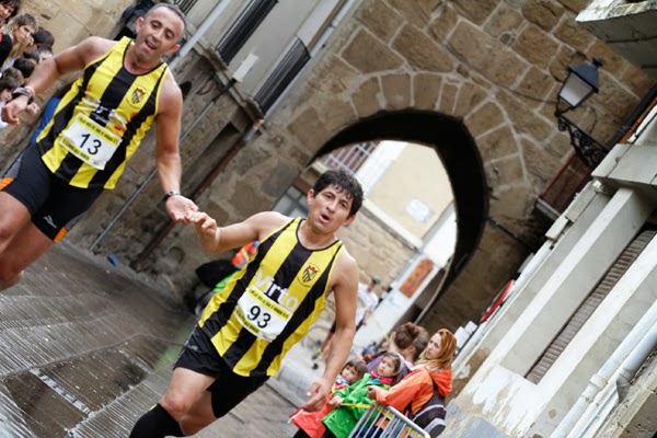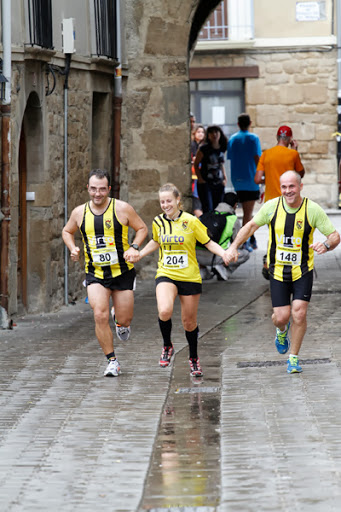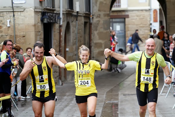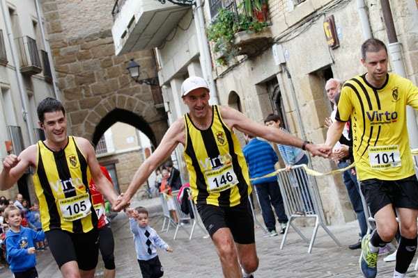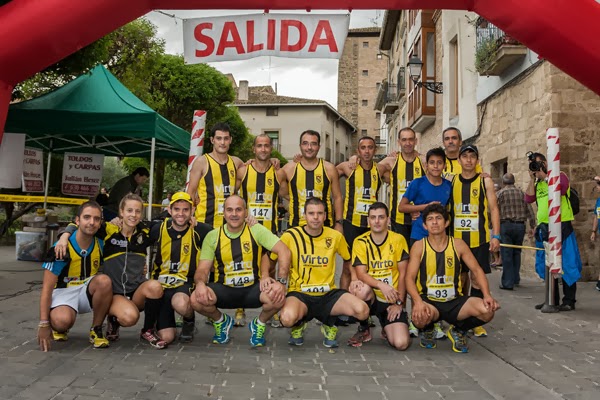 Casi sin tiempo de poder disfrutar de las fotos del sábado, otro grupo de runnerabejas nos desplazamos hasta la localidad de Olite, para disputar y disfrutar, de la primera carrera del ya prestigios Circuito solo runners, que tan bien organizan nuestros amigos del Calagurris, Felix y David. Como el año pasado la corrimos y nos gustó, este año repetiamos bastantes corredores. Yo me esperaba una decena, que ya está muy bien, pero que va…hasta 14 abejorros estabamos en Olite, sumando una nueva incorporación, Quique, que ya ha participado en alguna carrera de forma independiente y que quería correr con nosotros, con nuestro club. Bienvenido, Quique!!!. La mañana empezó genial, con muchas risas, con Fosi equivocándose de grupo en el Whatsapp , con otros añadiendo algo de picante al comentario , y todos con bastantes ganas de participar de esta bonita prueba con una marco incomparable, Olite. Nos repartimos en coches y después de recoger los dorsales, a calentar, estirar….fotos, mas fotos…miradas de complicidad según se acerca la hora…el ambiente, runner total!!! muchas ganas de correr con una mañana espectacular en lo meteorológico. Algunas veces, uno va a las carreras con mas ganas y tras con menos, pero es verdad, que calentando, viendo a la gente tan sana y tan maja que suele haber en estas competiciones populares, uno tiene que tener la sangre de horchata para que las piernas no empiecen a moverse solas, a sentir la necesidad de correr. Los pelos de punta cuando dan la salida, y me encuentro corriendo debajo de los arcos de esta localidad histórica, de este precioso pueblo amurallado con un imponente castillo……y pensar que hay gente que prefiere estar en la cama….ellos se lo pierden!!! Rapidamente abandonamos Olite y nos dirigimos a los caminos rurales que lo rodean. Dejo a Roberto pensando que irá algo cansado de los 10km de Logroño e intento coger a su hermano Tulio, que como siempre, ha salido muy rápido. Lo tengo muy cerca, va escoltado por Miguel de Valtierra, pero aunque se que queda mucha carrera, también sé que luego es muy dificil recortar diferencias…lo intento, lo vuelvo a intentar…pero llegamos a una curva donde observo que el bueno de Miguel me mira, reacciona y junto con el grande de los Mocha, dan un tirón que echa por tierra todo mi esfuerzo. Asi que me acomodo, y decido marcar un ritmo que me permita mantenerlos en el objetivo, y que tampoco me exija mucho esfuerzo. Rapido noto que aunque la mañana es muy buena, hace mucha humedad y que sudo bastante…en el primer control bebo abundante y me alivia. El camino por momentos se torna exigente aligerado por una agradable lluvia que refresca y hace que me sienta bien…..todo va según lo previsto, aunque echo de menos el gel que Guille me quería dar…mmmm una pena no cogerlo… el paso por las millas se hace lento, y cuando quedan dos, ya me noto que he sudado en exceso y que voy un poco tocadillo, decido echar el resto, pero una cosa es decirlo y otra es poder hacerlo. Ya muy cerca de la meta, Roberto me coge, pero no me sobrepasa a pesar de poder hacerlo y como buen compañero, me ayuda a llegar a la meta, eso si, con mucho sufrimiento!!! abrazo a Roberto y le doy la mano a Tulio, que se merece un comentario a parte. Después del carreron del sábado, sin recuperarse, hace otra carrera increíble, terminando como si nada….pero es que estos Mochas se cayeron en la pócima de Obelix?…o es ese gazpacho magico que prepara Roberto lo que les da esas fuerzas, esa velocidad…Tulio, apodado el Ninja, por su caparazón, es un monstruo, ha pasado una temporada irregular debido a un catarro mal curado, del que apenas se ha quejado, pero se ha recuperado y ha emergido como lo que es, un gran corredor, pero no es lo que mas valoramos de el en el Club, nosotros solo vemos a Tulio, el que si hace falta, nos ayuda, siempre echa una mano. Es verdad que no habla mucho, pero, es que le gusta hablar, corriendo….bravo Tulio!!!. Que decir de Roberto, pues como dicen, el halago en exceso, debilita….esta claro, se quedó conmigo, me ayudó….espiritu de runnerabeja. Casi sin resuello todavía, veo como llega David muy cerquita de nosotros…hoy ha sudado, se le nota trabajado, pero es normal, pregunto..quien se puede poner un traje de Superman musculado, y puede correr 16km en una hora 10 minutos, en tierra con desniveles…pues un superhombre, pues eso,…David!!!Los demás llegan a cuenta gotas, todos con cara de haberlo pasado genial, de haber disfrutado, con un Fosi que ha planteado mucho mejor la carrera y ha sacado jugo del recorrido, con un Carlos recuperando sensaciones despues de un verano para olvidar, con un Jesus mari que cada vez que se calza las zapas es para ser feliz corriendo, Carlos oses, que a poco que entrenara mas, estaría con el grupo de cabeza, con Victor mamotraco que se come las carreras como si nada, pero que disfruta como un niño pequeño, siempre aportando alegría al grupo, Fernando infatigable, Guille poniendo siempre anclajes de humildad a las estructuras del club, para que nunca nadie se olvide de que va esto de correr, con Virginia, que poco a poco , siempre con una sonrisa contagiosa, con una ilusión inabordable se está convirtiendo en el estandarte del club, decir lo mismo de Patxi, que de buena gente que es y de lo que le gusta el running, pareciera del Madrid y todo, siempre apoyando a todo el mundo, poniendo una pizca de sensatez, que para eso es profe y sintiendo que siempre ha sido un corredor como un genial, sufridor y pundoroso Quique, que seguro va a aportar muchas cosas a este grupo de gente necesitado siempre de mas buena gente como el…..Luego hubo cañas, risas, bromas…pero bueno, eso ya es otra historia…gracias a todos por estos días tan maravillosos!!!