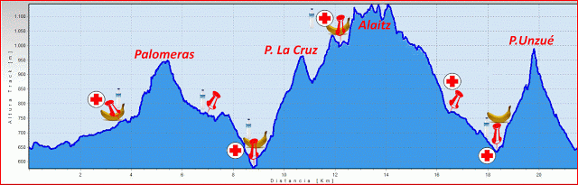Era la primera edición de la Hiru Mugak, que además la incluyeron como Campeonato Navarro Individual de Carreras de Montaña. Tenías 2 recorridos, el oficial con 21,5km y uno “popular” de 15km. Me quede con las ganas de preguntar a la organización que entienden por “popular”. 15km con las 2 peores subidas del recorrido. Popular es “El Soto” y no esto. Aquí dejo el perfil.
