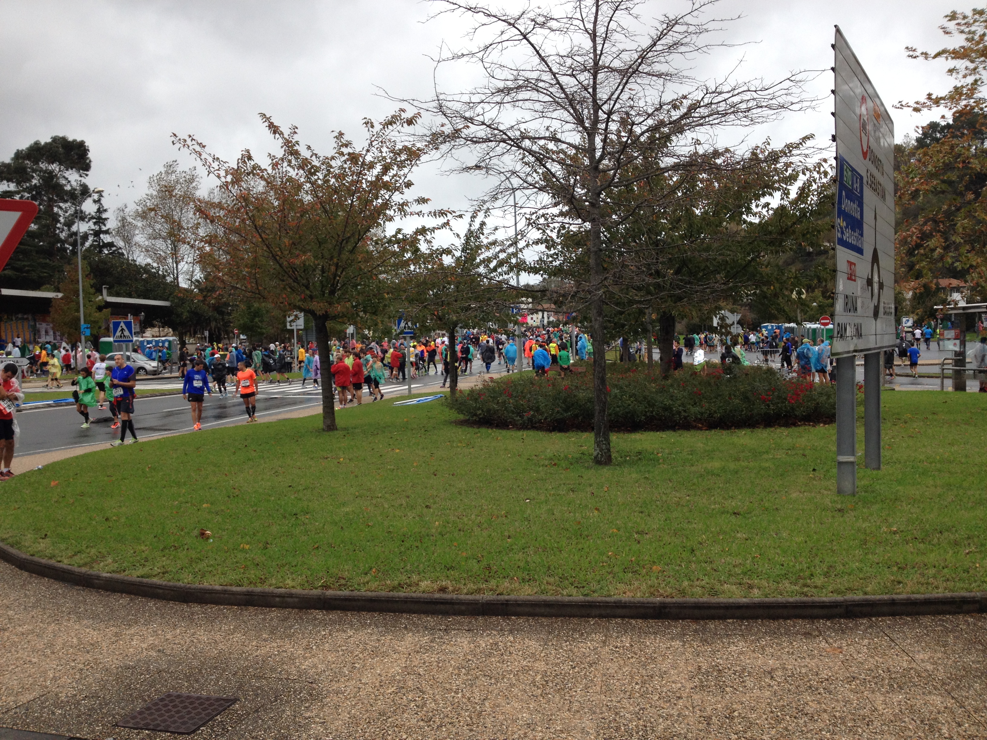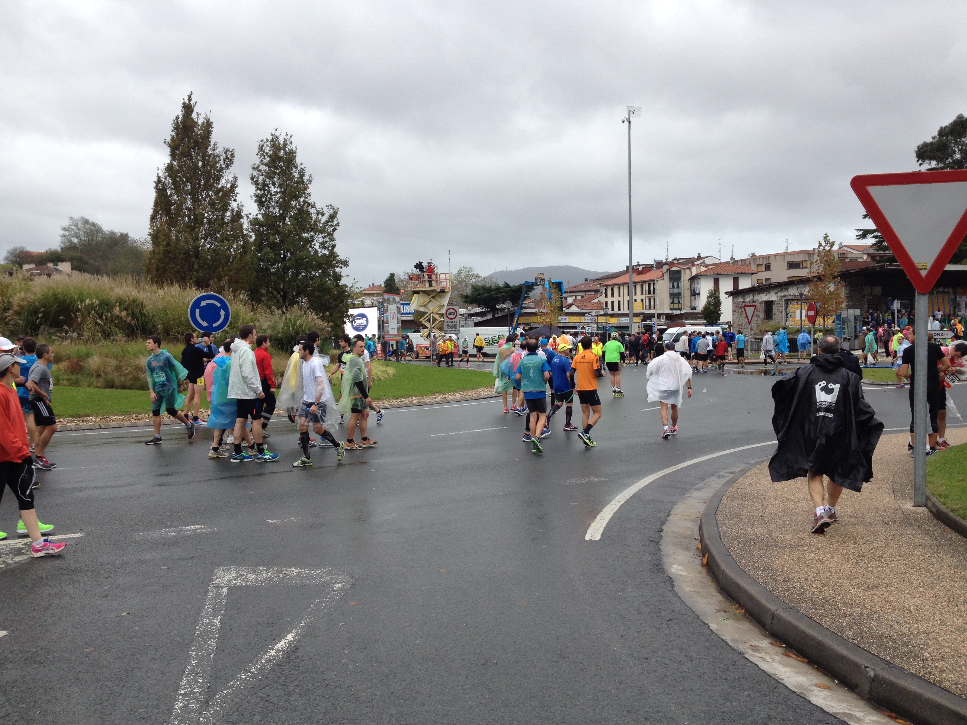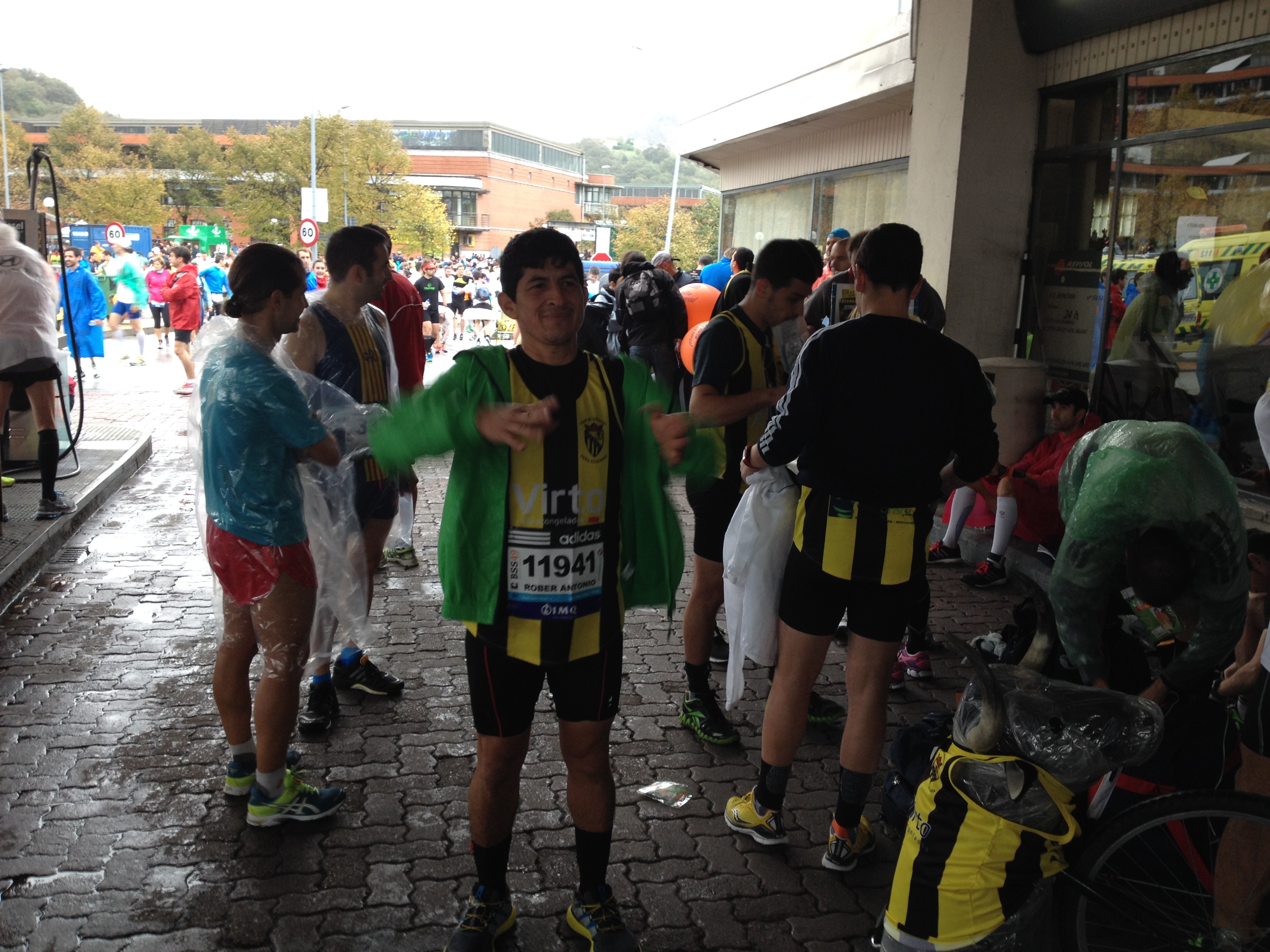 Sábado 09 de noviembre, 09’00 horas….suena el despertador. Me levanto molido. Fuerte contractura en las cervicales, dolor en la cintura y la cabeza apunto de estallar. Me pregunto como demonios pienso yo afrontar otro día en la Behobia, otros 20 km durillos, otro día duro , con una larga y fría espera y encima con previsiones de lluvia y fuertes vientos. Los dos últimos meses no han sido buenos, y , si me siento corredor, es por que sé que cuento con mucha gente detrás, no precisamente por salir a correr y entrenar como Dios manda pues mis salidas se han limitado a salir a correr dos o tres veces por semana y acudir al gimnasio siempre que me fuera posible. Mientas escucho un muy melancólico http://www.youtube.com/watch?v=Oextk-If8HQ con un café manchado de leche acompañado de una magdalena rancia miro por la ventana….el myolastan no entra, siempre he sido muy malo para las pastillas…veo pasar a tres personas no reconocibles corriendo por el motarron,,,y siento cosquillas por el estomago y me acuerdo de esa canción http://www.youtube.com/watch?v=-3ueYxrA-Zs . Con esa dignidad propia de personas que saben que tienen una misión que cumplir pero que también saben que no lo van a hacer bien, me levanto el domingo a las 5 de la mañana de ese 10 de noviembre tan esperado, el día que todo corredor popular que se precie en España tiene que sentir al menos una vez , el día de la Behobia . Es un día grande para el Club, nuestro primer viaje organizado a esta emblemática carrera, la mas prestigiosa sin duda de España, y ya en nuestro tercer año nos permitimos el lujo de organizar nuestro propio viaje, acompañado de amigos del Kandevico de Arnedo, La rioja. Según acudo al lugar donde ya nos espera nuestro autobús, siento algo especial. Es ya mi sexta vez que acudo a esta carrera, y esta vez las sensaciones son distintas. Será por la ilusión de Virginia, por la perseverancia de Fernando, por las ganas de Robert, o por la mirada perdida de Carlos…no lo sé…una vez dentro del bus, voy repasando la cara de todas estas personas hasta hace bien poco tiempo, casi desconocidas para mi….y veo en todos lo mismo, veo caras de runners, de tipos normales con una necesidad especial, correr y empaparse de la mejor carrera. Quince corredores de Azagra, quince personas especiales, que quieren vivir un día muy especial, con solo unas zapatillas como alma. También viene un toro, un toro como mascota, con nuestra camiseta, adornado de risas, comentarios graciosos, alegría y siento como mi cuerpo se destensa, se desata, y me siento vivo y me siento corredor y sobre todo me siento compañero de estas personas que aun siendo muy humildes, hoy se creen los Reyes del Mundo. Con nuestros amigos de Arnedo, iniciamos el viaje hasta Behobia, con previsiones de mucha lluvia. Nos importa un pepino. Vamos felices, contentos, es un autobús de locos. Las bromas van de un lado para otro, con tópicos ya forjados después de muchos días de entrenos….el amigo de Fernando, que no es otro que el tío del mazo, Patxi y su campo de fútbol preferido, el Mestalla…annn, el torito de Carlos… la generosidad de Jesus….todo hace que las dos horas de viaje sean de placer. Llegamos a Behobia y nos bajamos un poco atemorizados…la lluvía y el viento nos dan respeto, pero después de la foto para el Diario de Navarra, nos vamos envalentonando y nos damos cuenta que no es para tanto. Nos ponemos a resguardo en la gasolinera mas famosa para los running, y ya estamos algunos preparando las bolsas para las consignas, mientras Carlos se queda con todo el mundo con su toro azagrés. A estas alturas, yo me siento genial y estoy disfrutando como un enano de esta pre-carrera. Jose Ramon me invita a un café en el Faisan, pero no me apetece mucho ese lugar…mmmm, a ver si recibo una llamada rara y luego no puedo correr…jejeje. Después de entregar la bolsa, ya me siento un poco mas liberado, y como no hace mucho frío, estoy encantado de la vida. Damos unas vueltas por todos los lados con el torito azagrés, y nos damos cuenta que somos los protagonistas de la carrera. Carlos y Guillermo disfrutan como nunca y posan para un montón de cámaras de Tv . Virginia está como una niña con zapatos nuevos. Jesus Mari Navarro está con carucha, tiene mal cuerpo por una gastroenteritis inoportuna mientras los hermanos Mocha hacen lo de siempre, mirar de forma desafiante una carrera que saben que ellos se van a comer y no al revés. A Pedro le impresiona todo el espectáculo, mientras los hermanos Oses observan todo intranquilos. David, también alucina un poco, mientras va de un lado para otro, como buscando su lugar, al igual que Fosi, perdido en la novedad….Patxi parece preguntarse que demonios hace aquí, nervioso, esperando con incertidumbre la salida. Los primeros de la terna, somos Jose ramón, Tulio y yo, Pablo. Se nos hace cortisima la espera, y sin apenas calentar, tomamos la salida. Una gozada poder contar con el apoyo de nuestros compañeros en un salida no muy rápida, un poco abotargada de gente. Los tres adelantamos a mucha gente, sin lluvia, sin casi viento y una temperatura excelente. Nuestra meta es coger la referencia de 1 hora y 30 minutos y luego ya tomamos una decisión según nos encontremos. A los tres km ya lo hemos conseguido, y le digo a Tulio que avance, que se le ve mas fresco que a nosotros. El ir con la referencia de tiempo está bien por que sigues un ritmo estable durante la carrera, pero tiene el inconveniente de que vas muy en pelotón…por esto, decidimos avanzar un poco mas. Pero me veo con fuerzas y tiro hacía delante muy rápido . Tanto que cogemos a Tulio. Sigo apretando y poco a poco voy notando que cada vez voy a mas. No miro para atrás, no me gusta. Estoy disfrutando y no me importa nada.La carrera es un reguero de gente corriendo y otro animando. Llegamos al puerto y sigo estando fuerte. Me acuerdo de David, de como a progresado como corredor, también de Carlos 