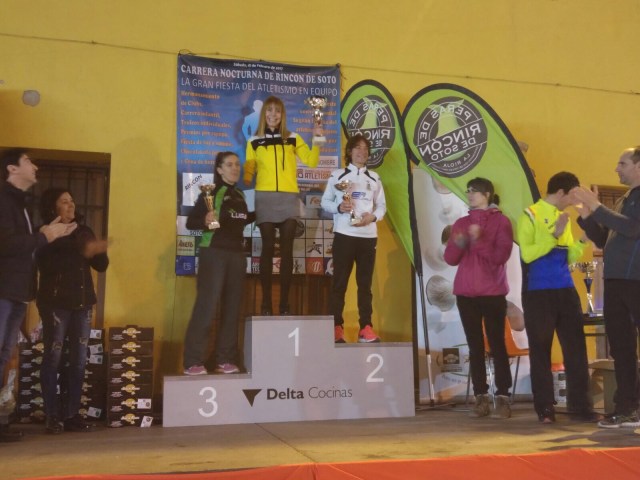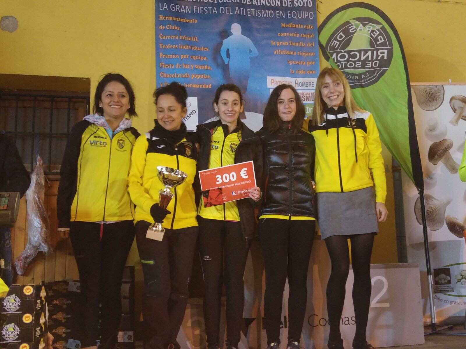 Comenzaron a dar los premios individuales y Olmo subió al pódium como 1ª de su categoría y 2ª de la general , empezábamos bien, pero lo mejor vino en los premios grupales cuando el speaker nombró al mejor equipo femenino, “EL CLUB DE ATLETISMO PEÑA AZAGRESA”, que sorpresa, ilusión, emoción , las chicas invadimos el pódium mientras nos daban una tarjeta de Eroski de 300 € y el peso en peras de Olmo, o lo que es lo mismo, once planchetas de peras con bromas incluidas que nos sacaron un poco los colores.